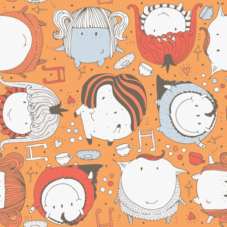 かわいい漫画のスタイルの落書き文字アイスクリーム 面白いシームレスパターン 絵文字顔アイコン 手描きの白い背景に分離された黒インクイラスト プレミアムベクター